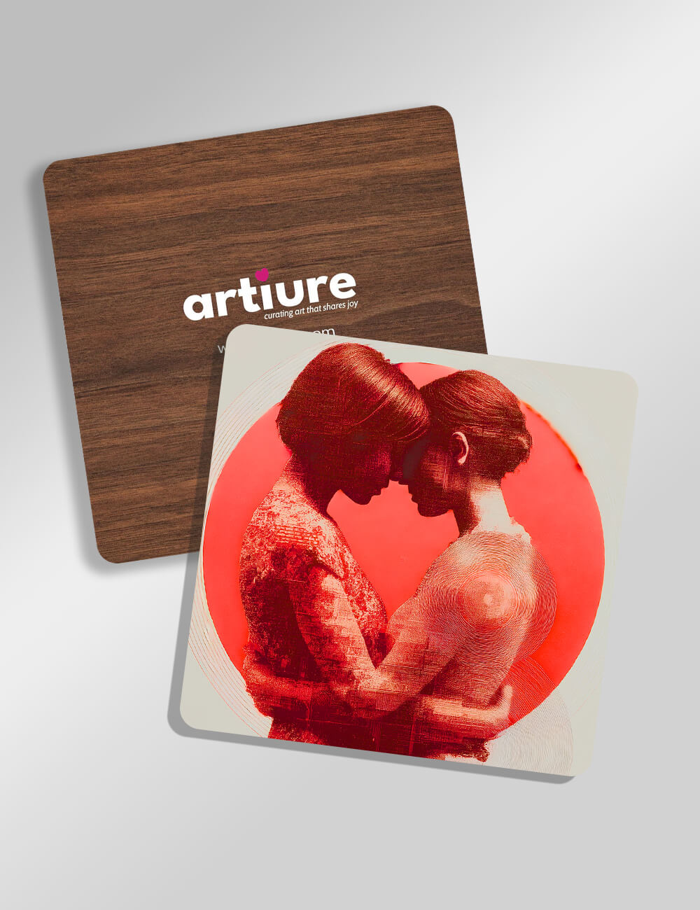 A contemporary abstract scene graces a pair of coasters where two figures lean into each other within a vivid red circle. The back features a warm wood grain, enhancing the tactile mix of natural material and graphic art. The composition fuses romance with minimal geometry, making these coasters a striking focal point in dining spaces or living areas. Designed for everyday use, they blend artful expression with functional decor, ideal for gifting or elevating a coffee corner. The image balance and softened edges invite quiet sophistication, while the bold color acts as a conversational anchor in modern kitchens and entertaining setups.
