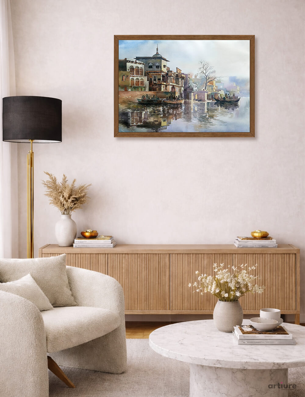 “Reflections Along the Sacred Ganges” beautifully captures the spiritual essence and timeless rhythm of life along India’s most revered river. This watercolor artwork portrays historic ghats, traditional architecture, and gently floating boats mirrored in calm waters, creating a poetic balance between reality and reflection. Soft washes and delicate brushwork evoke a peaceful atmosphere, where daily rituals and sacred traditions unfold naturally. The interplay of light, mist, and muted tones enhances the depth and serenity of the composition. This piece invites viewers into a contemplative journey, celebrating the cultural richness, spiritual energy, and quiet beauty of the Ganges.