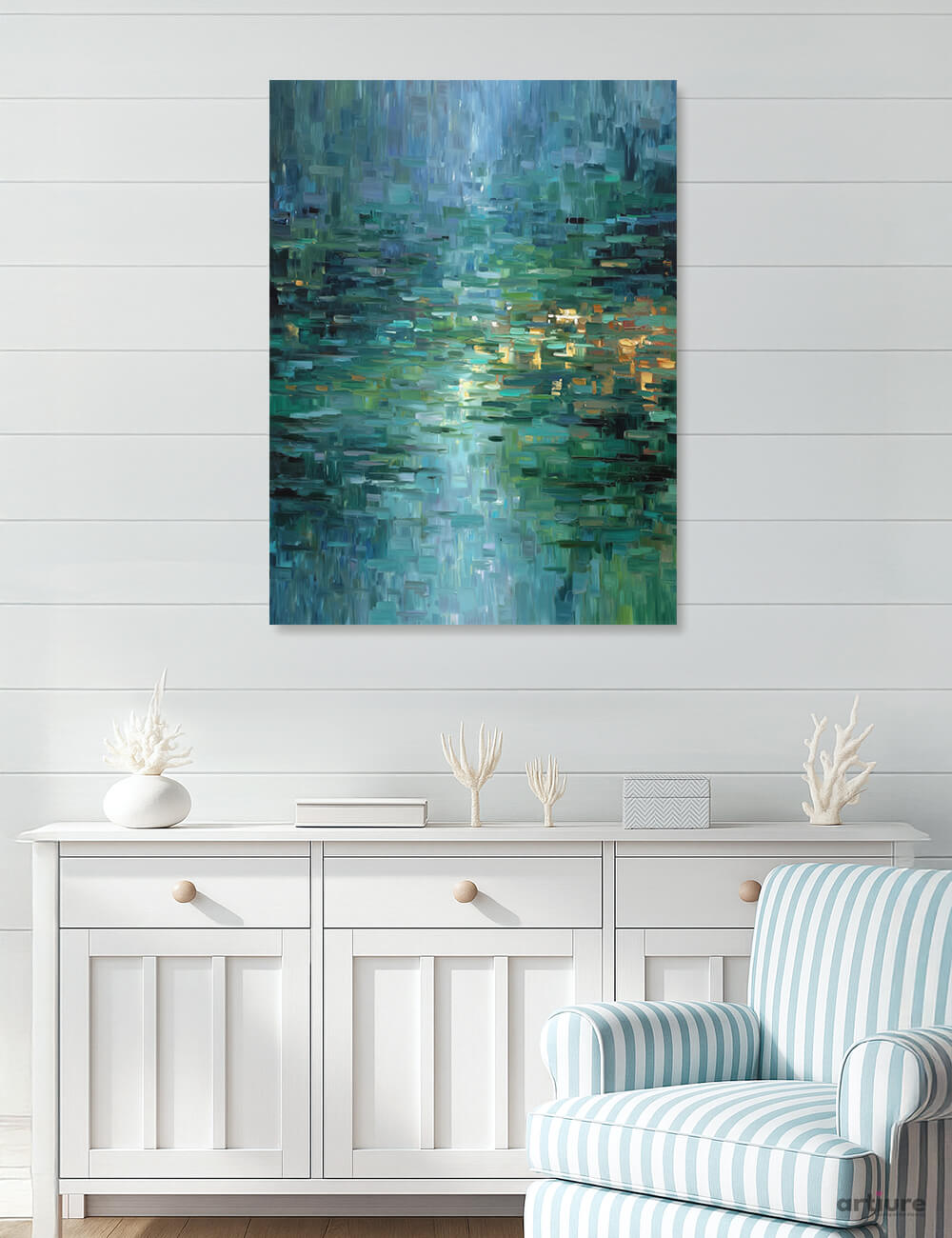 An immersive abstract canvas print where blocky strokes dissolve into a luminous river of teal and blue, punctuated by warm gold flecks. The composition shifts from cooler blues at the top to richer greens and amber highlights toward the center, evoking light dancing on water. Textured brushwork suggests movement and depth, inviting quiet contemplation in airy spaces. Printed on high-quality canvas, this piece maintains a painterly spontaneity while offering crisp color across a 4x3 format, ideal above a console or sofa. Its cool, oceanic palette pairs with coastal or contemporary interiors, adding a serene focal point without overpowering the room. A versatile statement that complements soft neutrals and natural textures.