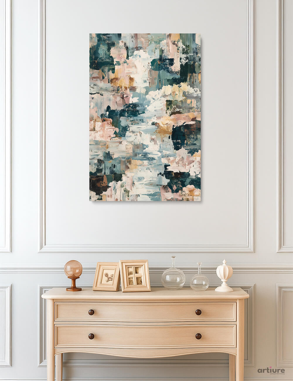 An expansive canvas of layered brushstrokes in teal, blush, ivory, and muted greens. This abstract composition invites the eye to drift across chromatic blocks, revealing texture and depth as paint seems to bloom and recede. The palette blends cool and warm neutrals, making it versatile for contemporary interiors and quiet living spaces. Hung on a light wall, the piece acts as a coastal-inspired focal point that complements beige furnishings and white moldings. Its tactile surface echoes the hand of the artist, while the overall composition remains uncluttered, allowing for easy pairing with furniture and art collections. A refined statement for modern spaces seeking calm energy and visual intrigue.