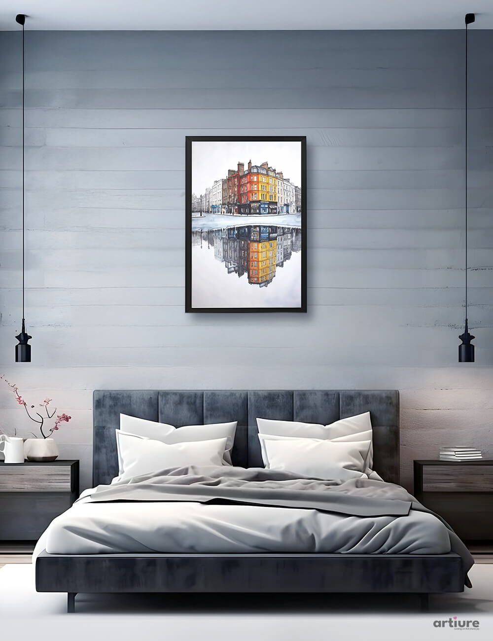 Reflections of Soho presents a vibrant intersection of London architecture, rendered in detailed watercolor with a dreamy mirror-like puddle reflection. The color pop of red, orange, and yellow facades stands out against the grayscale surroundings, offering a nostalgic yet contemporary tribute to urban life. Ideal for those who appreciate symmetry, city aesthetics, and moody elegance.