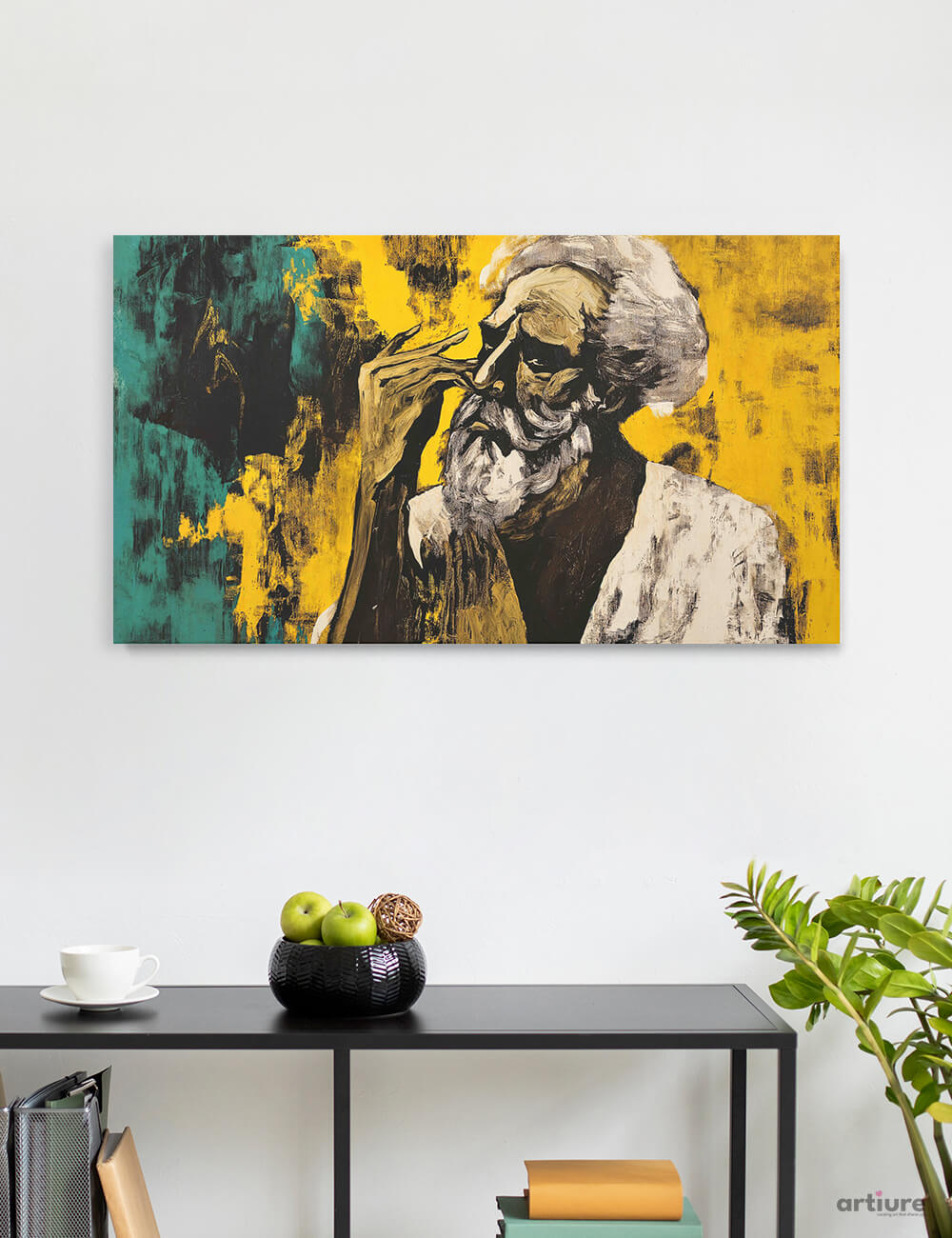 Reflective Sage presents a contemplative elder, rendered in bold, painterly strokes that fuse traditional influences with modern expression. The warm gold and deep black palette highlight both the figure’s wisdom and the artwork’s dramatic flair—ideal for living rooms, offices, or cultural spaces seeking a profound focal point. Limited Edition: Only 250 prints available, each individually numbered for authenticity.