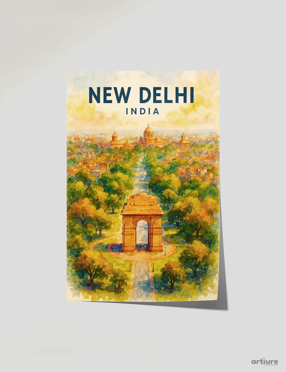 This poster captures the regal axis of New Delhi with a serene watercolor aesthetic. From the foreground India Gate to the distant Rashtrapati Bhavan, the artwork traces the ceremonial heart of the Indian capital, flanked by lush green trees and historic architecture. A blend of heritage and calm urban planning, this piece pays tribute to the dignified beauty of India’s seat of power.