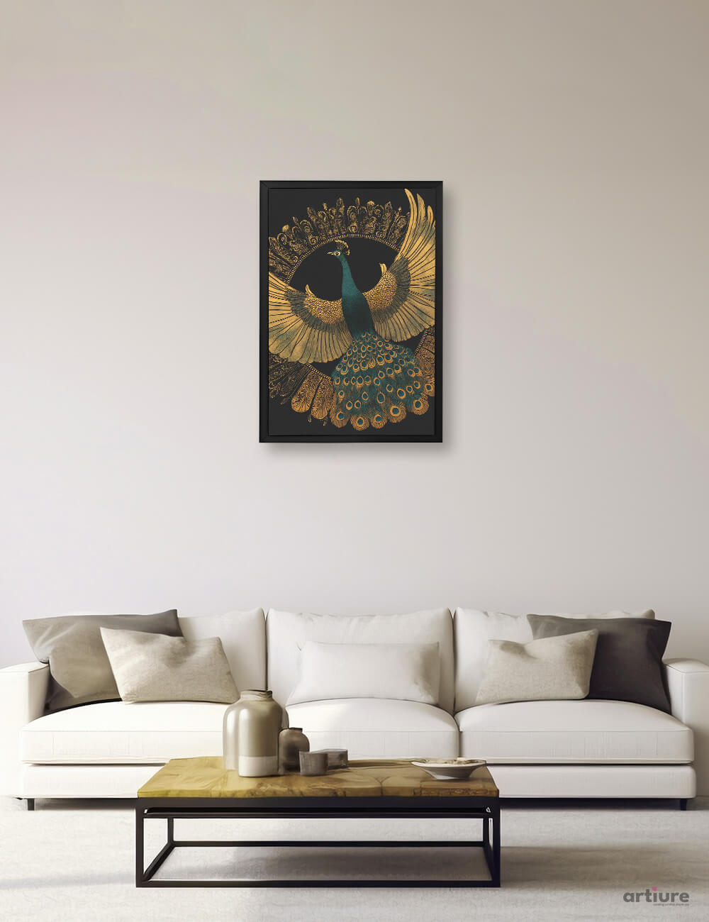 This striking piece features a peacock in mid-flight, its teal feathers and radiant gold plumes painted in intricate detail. Set against a deep black canvas with an ornate crown-like arch, the composition speaks of grandeur, cultural richness, and divine symbolism. Perfect for interiors that embrace bold elegance and traditional artistry.