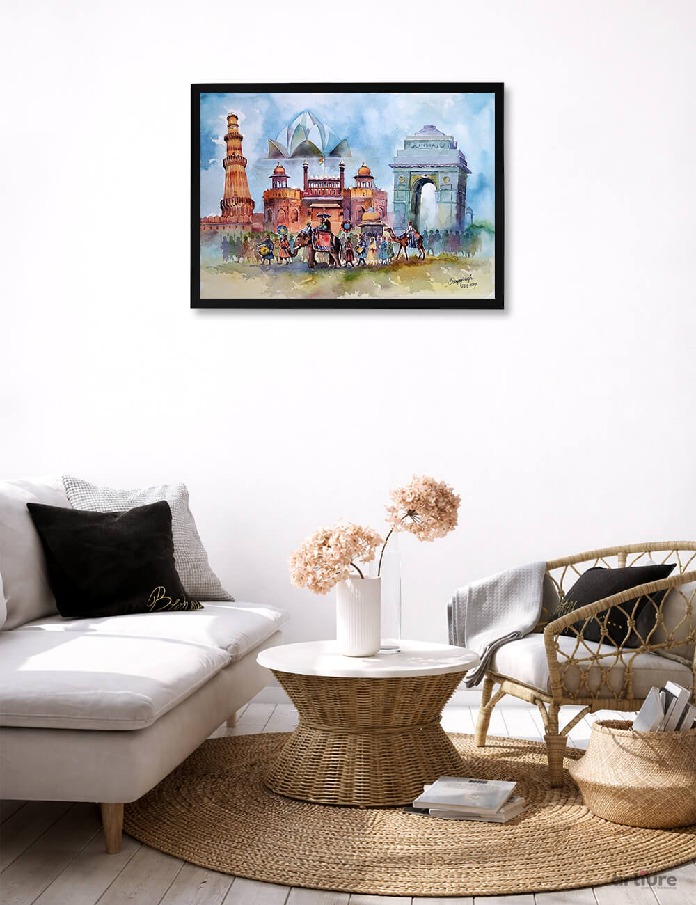 Rhythm of India beautifully portrays the soul of the nation through a lively watercolor composition featuring iconic landmarks and cultural life. From the majestic Qutub Minar to India Gate and the Red Fort, the artwork brings together history, architecture, and human activity in one harmonious frame. The procession of people, animals, and daily scenes reflects India’s diversity and vibrant spirit. Soft watercolor textures enhance the fluidity, giving the painting a dreamlike yet grounded feel. This piece celebrates unity in diversity, capturing the timeless rhythm of India’s traditions, heritage, and collective identity through expressive colors and intricate storytelling.