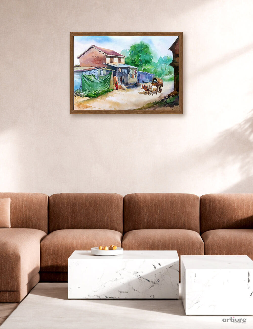 “Rhythms Of Village Life” beautifully captures the simplicity and harmony of rural living through delicate watercolor strokes. The composition portrays a quiet village pathway where daily life unfolds naturally—women walking, cattle moving steadily, and rustic homes standing gracefully amidst greenery. The earthy palette and soft washes evoke warmth, nostalgia, and authenticity, reflecting a life deeply connected to nature. Subtle details like the bullock cart, textured walls, and surrounding trees add depth and storytelling to the scene. This artwork celebrates the timeless rhythm of village life, where simplicity, community, and tradition blend seamlessly into a peaceful and enduring visual narrative.