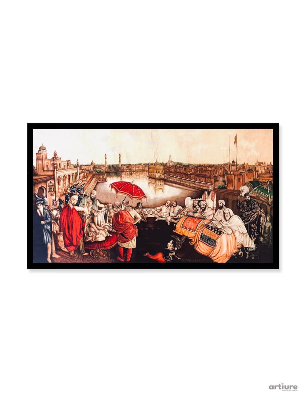 “River Ritual” reflects Arun Bajaj’s ability to translate spiritual movement into textile form. The artwork presents a ceremonial moment where devotion flows as naturally as the river itself. Priests, attendants, and observers gather within an architecturally rich setting, suggesting a sacred continuum between humanity and nature. Carefully balanced composition and expressive detailing guide the viewer’s gaze across rituals and interactions. The subtle contrast of textiles, ornaments, and gestures enhances narrative depth. This piece honors India’s river traditions, emphasizing spiritual unity, historical continuity, and the ceremonial rhythms of life.