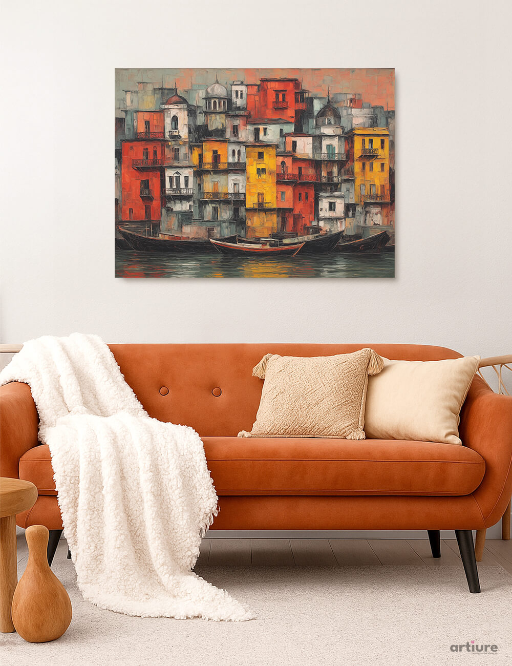 An energetic canvas print capturing a coastal cityscape where colorful buildings stack along the water's edge. The artist's impressionistic brushwork creates a rhythmic tumble of red, yellow, orange, blue, and gray, echoing the bustle and warmth of a sunlit harbor. The scene blends architectural charm with a painterly texture, inviting the eye to wander across balconies, domes, and boat-filled waters. Printed on canvas, the piece offers a tactile, gallery-like presence that elevates modern living rooms and creative spaces. Its saturated palette pairs well with neutrals and mid-century furniture, making it a focal point that sparks conversation without shouting. A joyful celebration of urban life rendered in vivid, harmonious blocks.