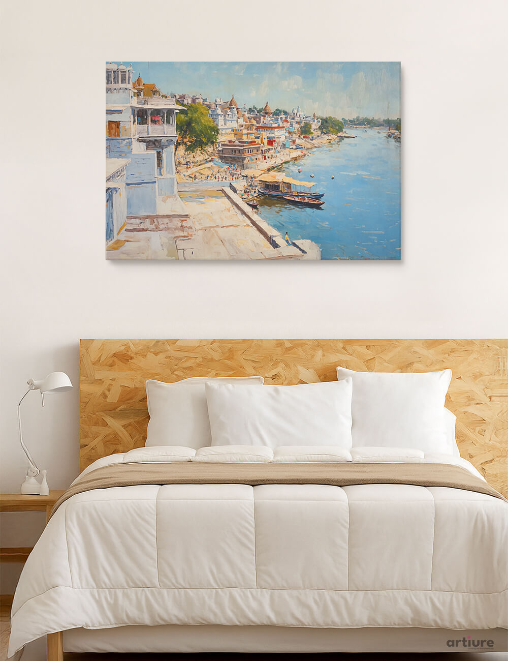 An impressionist cityscape rendered on canvas prints a sunlit riverside vista. Architectural facades line a busy quay, boats glide along the water, and a canopy of blue skies reflects in tranquil blue hues. Warm beiges and browns anchor the composition, while greens from trees provide fresh contrast to the cool water. The print captures the energy of a harbor town with loose, confident brushwork and luminous highlights, making it a versatile centerpiece for a bedroom or living space. Its airy palette and balanced composition evoke calm moments amid urban life, pairing well with neutral textiles and wood furniture to create a refined, contemporary retreat.