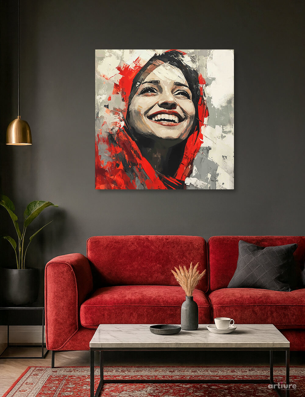 Scarlet Radiance captures the uplifting spirit of a joyful woman, her broad smile and upward-gazing eyes radiating optimism. Clad in a vibrant red hood, her portrait is expressed through bold, dynamic brushstrokes that blend rich shades of red with accents of gray and white. The abstract background features rough textures and splashes of red and gray, reinforcing the subject's inspiring expression. With a direct, front-facing composition and an impressionistic style, the piece exudes a mood of hope and positivity—ideal for any space that celebrates light and inspiration.