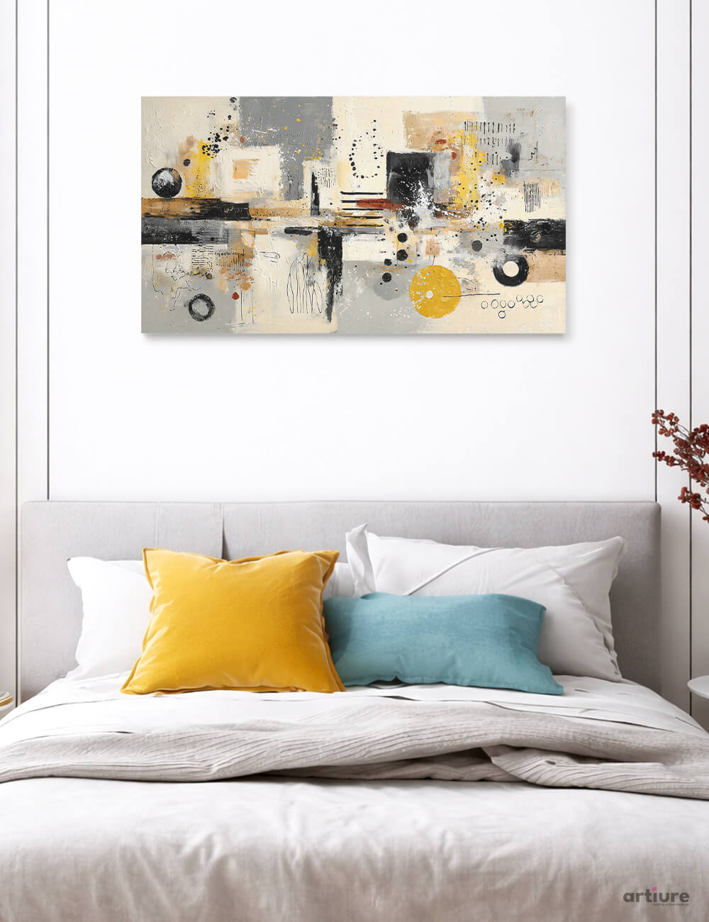 Some days your mind feels like this — scattered, layered, but somehow making perfect sense. Golden bursts interrupt careful grays, while black marks dance between order and impulse. There's handwriting you can't quite read, circles that might be thoughts or planets, and splashes of paint that feel like sudden clarity. The composition breathes with controlled chaos, each element finding its place in the beautiful mess of creativity. It's the visual equivalent of a breakthrough moment — when all the fragments finally click. Perfect for spaces where ideas happen — a home office wall, a studio corner, or above a desk where dreams take shape.