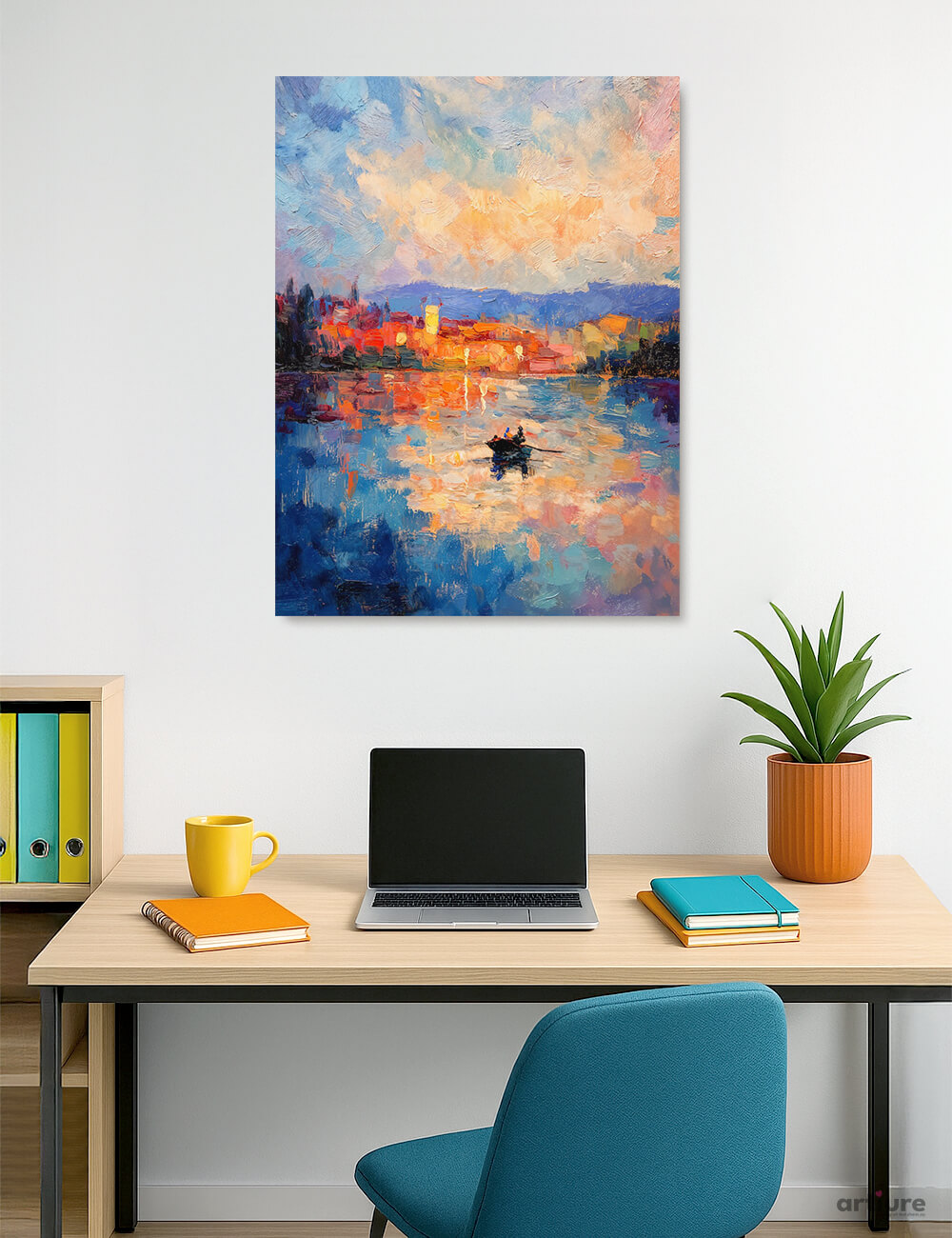 This canvas print presents a vibrant harbor city at dusk, rendered in bold impasto strokes that fuse sky, water, and shoreline into a radiant tapestry. The composition centers a lone boat on shimmering water, its silhouette mirrored by the glow of city lights and the warm blaze of sunset hues—orange, pink, and gold mingling with deep blues and purples. The brushwork suggests motion and atmosphere, giving the impression of a fleeting moment caught in paint. Ideal for a bright home office or living room, it adds energy and color without overpowering surroundings. The piece invites contemplative viewing from across the room, turning everyday walls into a sunrise of urban poetry.