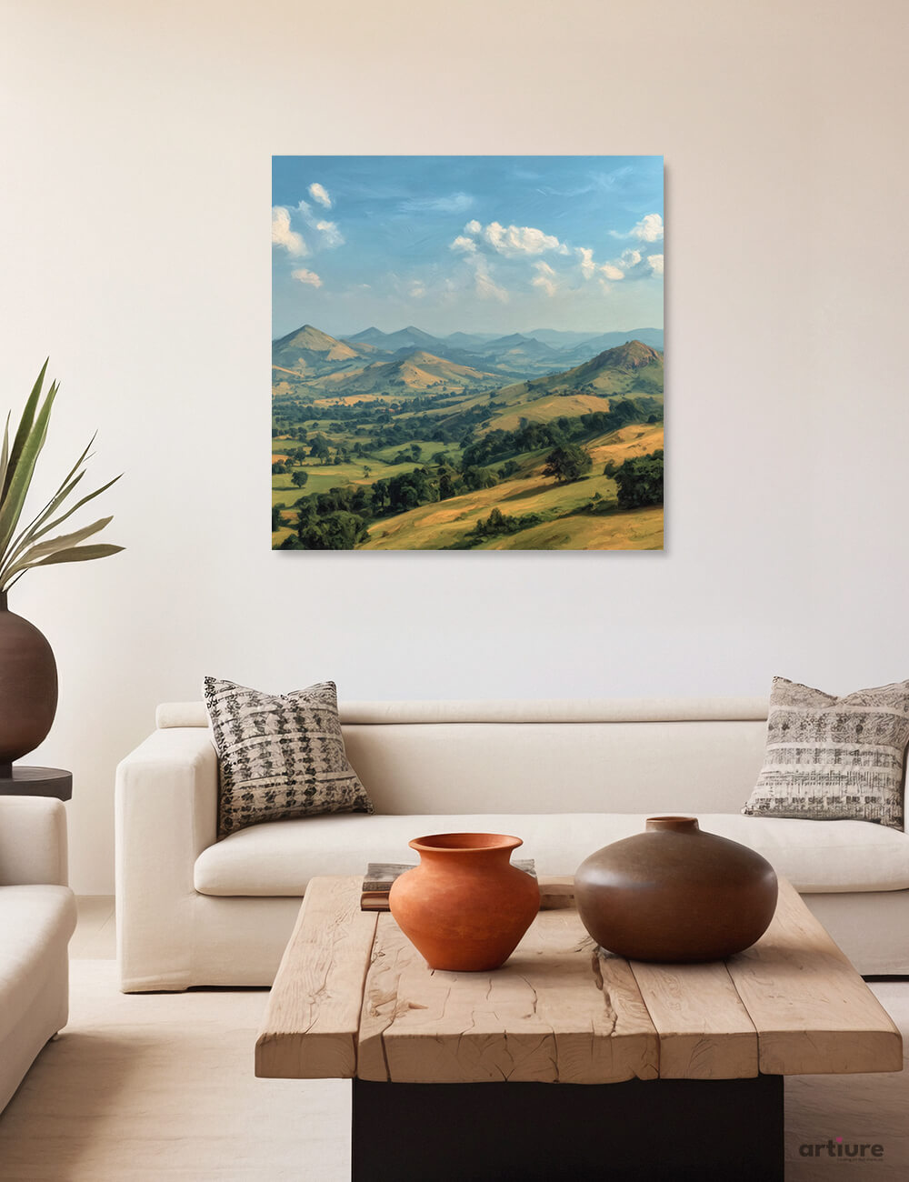 This AI-generated canvas print captures a sunlit hillside panorama, where rolling fields ripple with olive and gold beneath a clear blue sky. The composition invites a quiet gaze across valleys dotted with trees, creating a sense of spacious calm that anchors a living room or study. The realism of light and shadow is tempered by a painterly softness, making the scene feel timeless yet contemporary. Framed as a 1-by-1 square, the piece pairs well with neutral interiors and natural textures, from linen cushions to ceramic vessels. Ideal for spaces seeking serenity, it evokes long afternoon light and the gentle mood of a countryside escape.