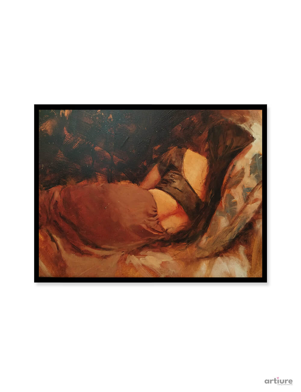 “Shadows of Intimacy” is a captivating oil on canvas painting that explores quiet vulnerability and emotional depth through warm, earthy hues. The composition reflects a moment of stillness, where light and shadow embrace the subject in a soft, painterly dialogue. Expressive brushstrokes and textured layers create a sense of movement and realism, enhancing the emotional intensity of the artwork. The rich browns, burnt siennas, and muted highlights add warmth and sophistication, making it a powerful statement piece. Ideal for contemporary interiors, this painting evokes introspection, comfort, and artistic elegance, bringing depth and character to any curated space.