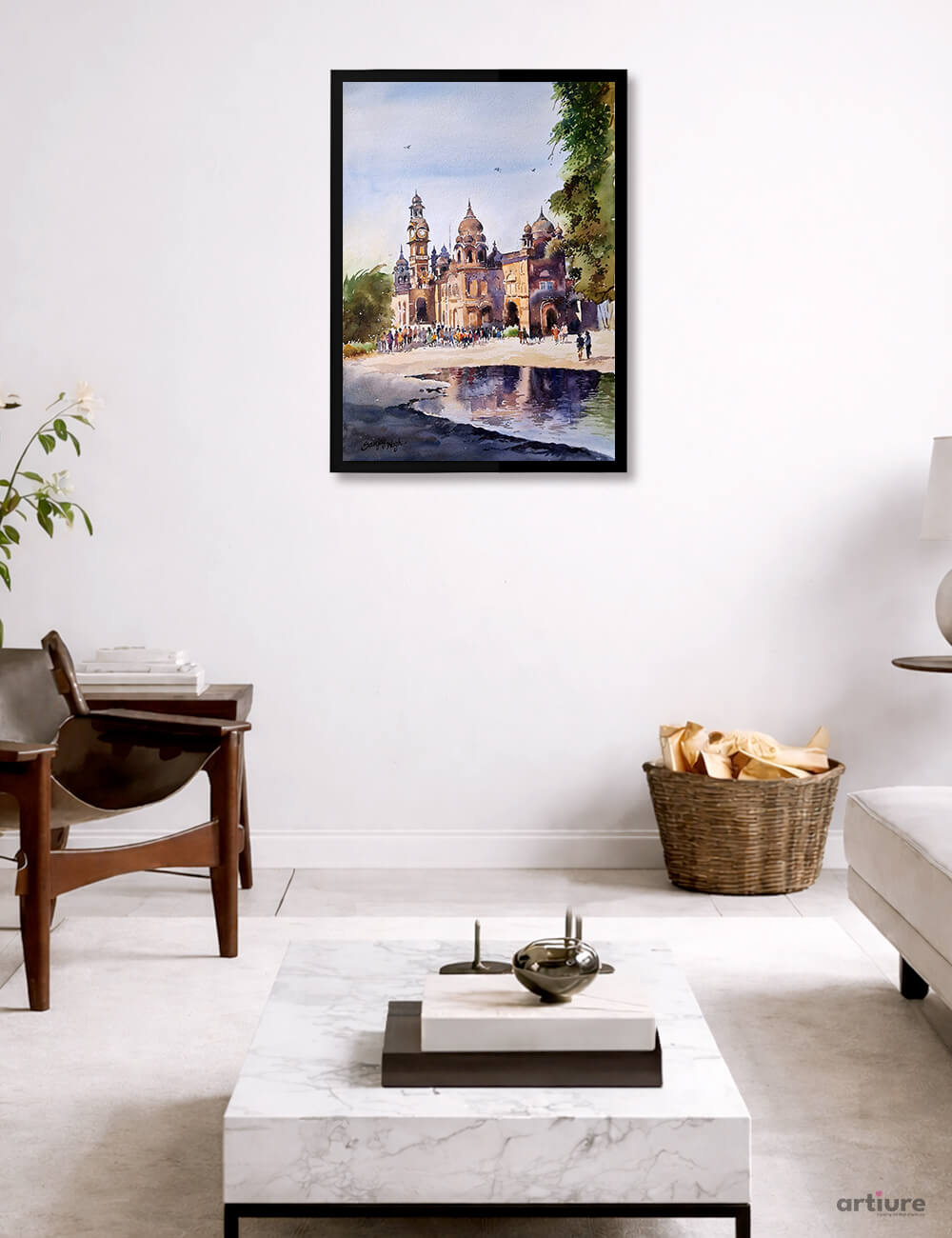 “Shahu Palace – A Living Legacy” beautifully captures the grandeur and historical richness of an iconic palace through expressive watercolor strokes. The artwork showcases intricate architectural details, domes, and clock towers, brought to life with warm earthy tones and soft sky hues. In the foreground, subtle reflections in water enhance the composition, adding depth and serenity. The presence of people introduces a lively narrative, symbolizing the connection between heritage and daily life. This painting evokes nostalgia, pride, and admiration for cultural legacy, making it a timeless piece that blends history, artistry, and emotional storytelling in a harmonious visual experience.