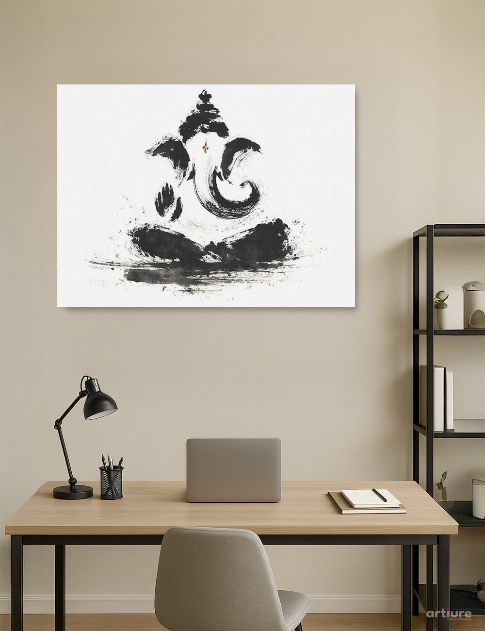 Silent Benediction captures Lord Ganesha in an abstract, ink-brush form, where the divine presence emerges through bold, fluid strokes. The composition balances strength with serenity, portraying Ganesha seated in deep stillness. A small red tilak at the center becomes the soul of the piece, symbolizing auspiciousness and spiritual focus. The raw brush textures evoke both motion and silence, reminding viewers of the power in simplicity. Ideal for sacred spaces, meditation rooms, or contemporary interiors seeking a touch of devotion with modern minimalism.