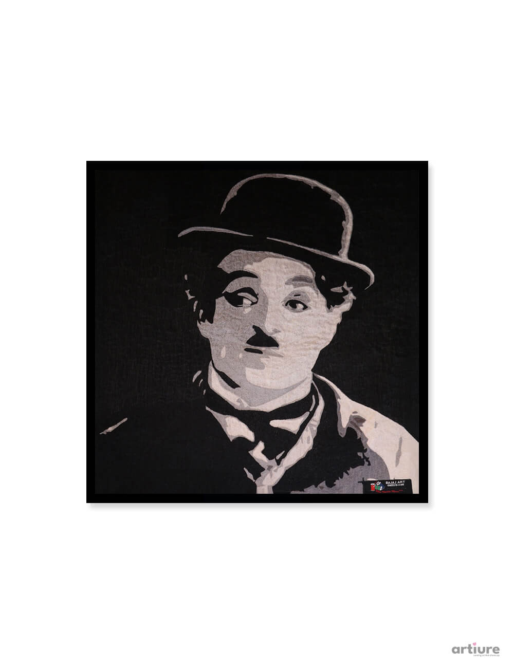 This striking textile artwork by Arun Bajaj presents a powerful monochrome portrait inspired by classic cinematic expression. Rendered through layered textures and tonal contrasts, the composition conveys emotion, nostalgia, and silent storytelling without excess detail. The controlled use of light and shadow highlights facial expressions, drawing viewers into a moment of reflection and timeless charm. The square format enhances balance and symmetry, making it visually impactful in both modern and vintage interiors. Crafted with precision on textile, the artwork bridges fine art and popular culture, celebrating the enduring influence of silent-era iconography through a contemporary artistic lens.