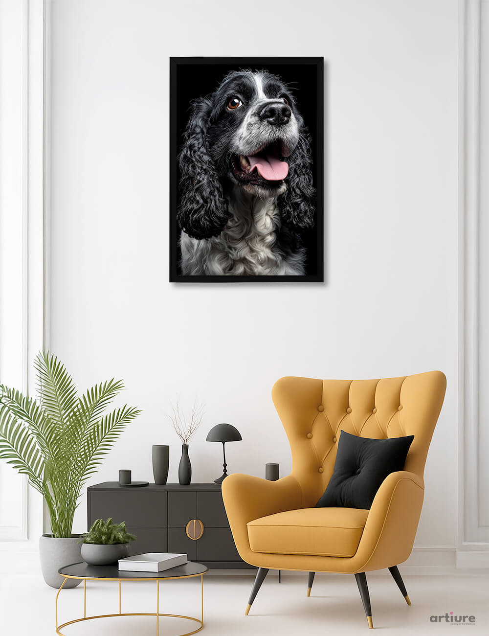 A lifelike Sir Charles Cocker Spaniel canine portrait centers a cheerful spaniel against a rich black frame, hung in a bright, contemporary living space. The image captures glossy fur, expressive eyes, and a playful smile, rendered with photographic clarity that makes the dog feel almost present. The surrounding room—a mustard-yellow armchair, muted neutrals, and a touch of greenery—complements the artwork with warm, inviting tones. This wall print blends pet-friendly charm with modern interior design, ideal for living rooms, gateways, and entryways where a friendly focal point is desired. The piece exudes approachable warmth, making it a versatile accent for dog lovers and art enthusiasts seeking a characterful, contemporary aesthetic.