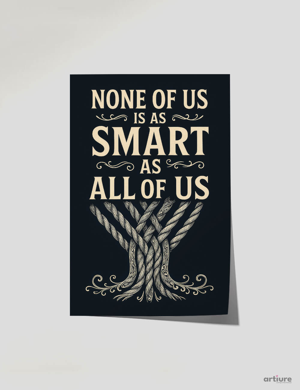Celebrate the power of teamwork with this motivational poster that reads: "None of us is as smart as all of us." Designed with vintage-inspired typography and an intricate rope-tree illustration, it speaks to the strength in collaboration and shared knowledge. Printed on FSC-certified, age-resistant paper, this poster is perfect for workspaces, classrooms, leadership retreats, or team-building events. A meaningful addition to the Words That Matter collection, it blends inspiration with sustainability—both in message and material.