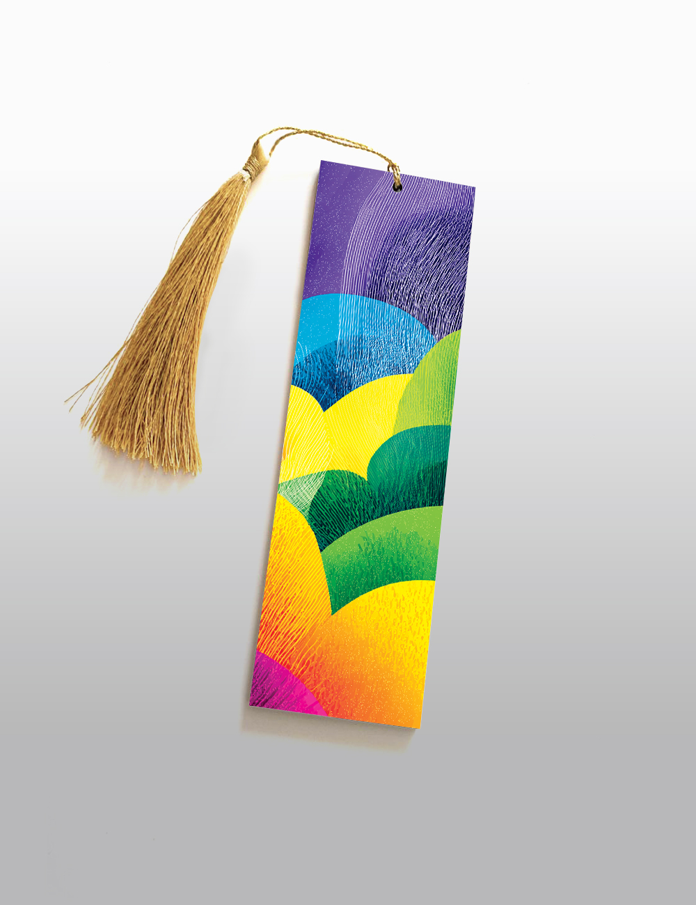 "Spectrum Hills" Wooden Bookmark (2 x 6 inch) is crafted from 2.7 MM Pine Wood, UV printed on both sides. This dynamic design features overlapping hills in a vivid gradient — from deep purples and blues to bright yellows, greens, and warm oranges — evoking a dreamlike landscape filled with energy and positivity. Finished with a golden tassel, it adds a burst of color to every reading journey.
