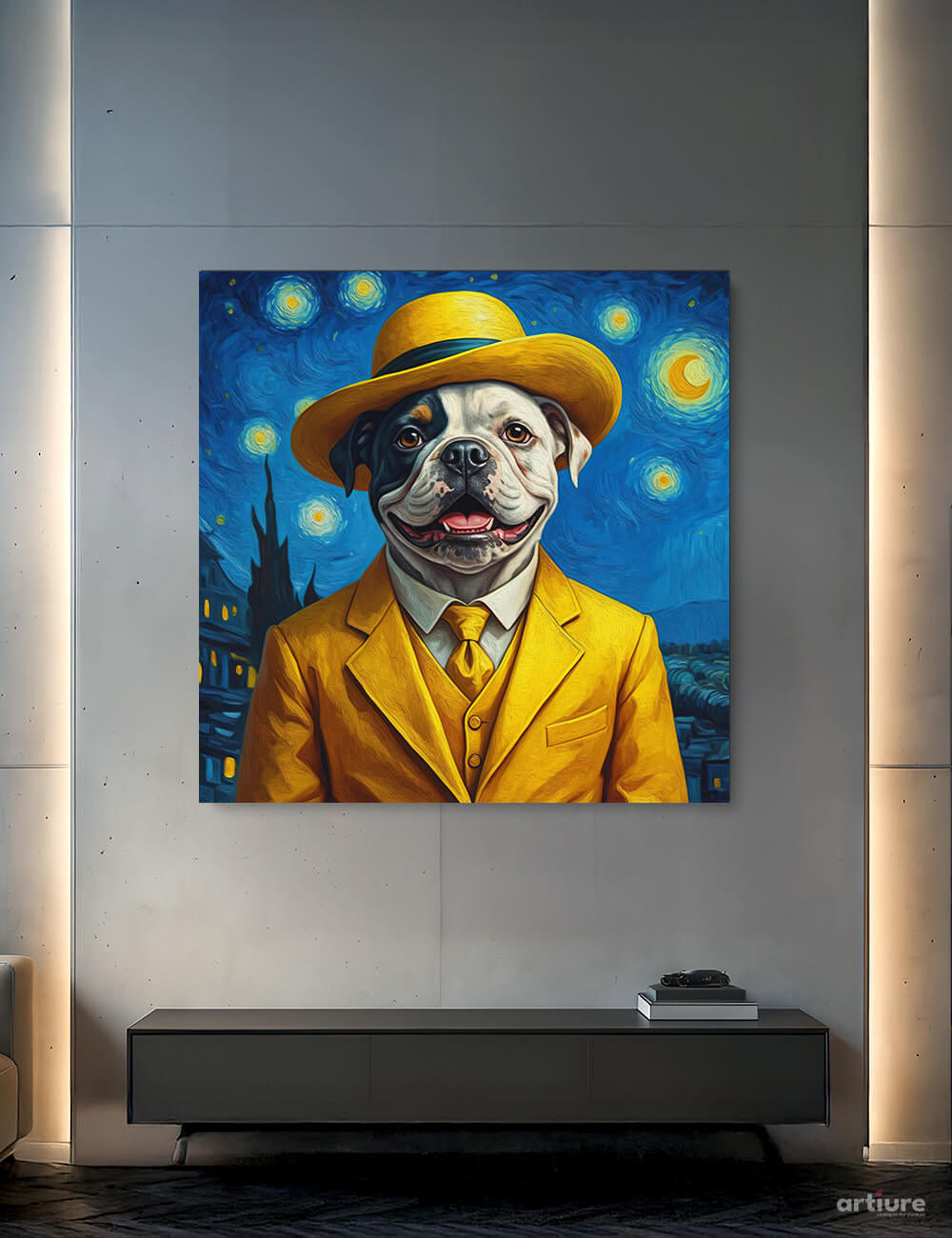 Starry Night Bulldog presents a charming pup wearing a bright yellow ensemble, standing against a painterly nocturnal sky. The swirling stars and bold brushstrokes nod to Van Gogh’s iconic style, while the dog’s confident expression adds a humorous twist. Ideal for eclectic interiors, pet lovers, or anyone seeking a fun, art-inspired conversation piece.