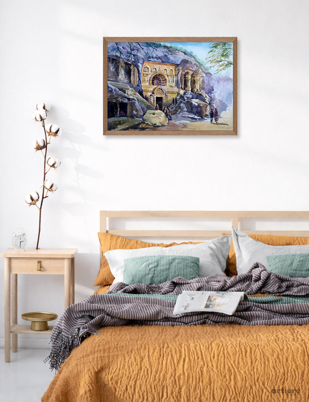 Stone, Faith, Time - Pandavleni beautifully portrays the historic rock cut caves nestled within rugged hills, reflecting India’s ancient spiritual legacy. The watercolor technique softly blends earthy tones with architectural precision, highlighting carved facades, arches, and weathered stone surfaces. Human figures add scale and life, symbolizing ongoing connection between past and present. Light and shadow interplay enhances depth, creating a serene yet powerful atmosphere. This artwork invites viewers to experience devotion, history, and natural harmony together, capturing the timeless essence of sacred spaces shaped by faith, endurance, and artistic brilliance across generations in every delicate brushstroke and visual narrative form.