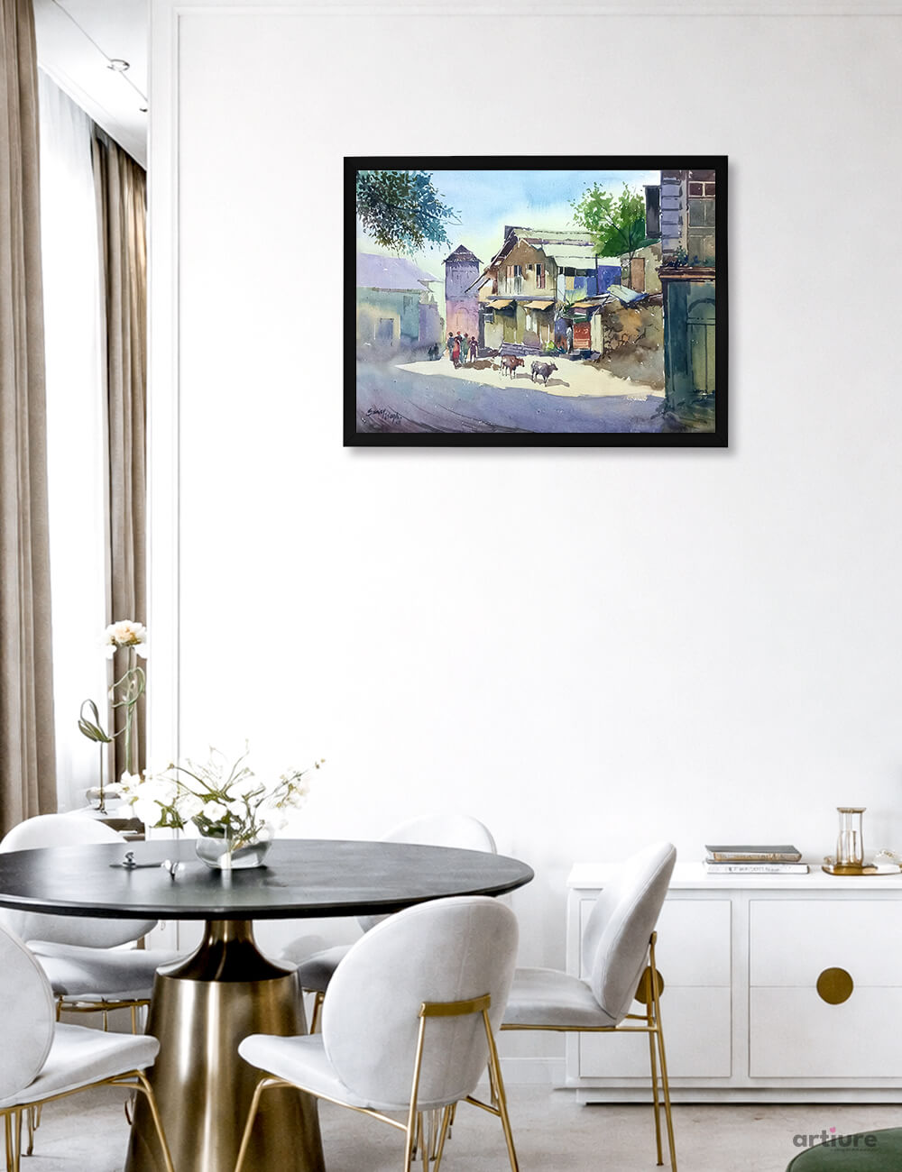“Stories on the Dusty Road” beautifully captures a tranquil rural street where life unfolds in gentle, unhurried moments. Rendered in soft watercolor tones, the artwork highlights sunlit pathways, weathered homes, and subtle human activity that bring warmth and authenticity to the composition. The presence of villagers and animals adds narrative depth, suggesting stories of daily life, tradition, and connection. The delicate interplay of light and shadow enhances the atmospheric perspective, creating a sense of calm and nostalgia. This piece invites viewers to pause and immerse themselves in the quiet charm of a timeless countryside setting.