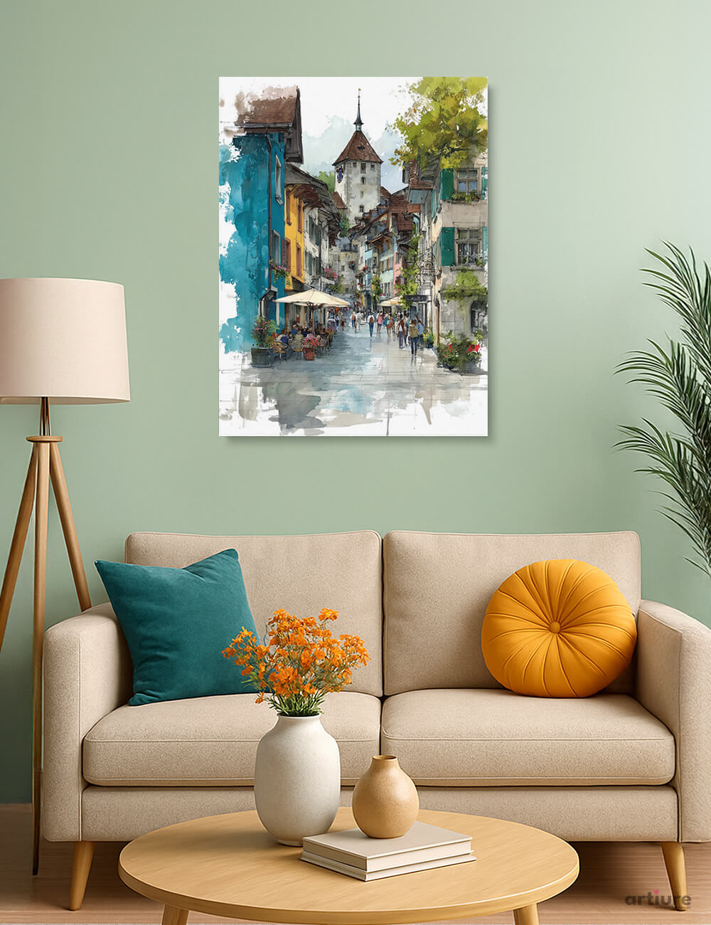 Streets of Lucerne captures the vibrancy of a European old town street, lined with colorful facades, flower boxes, and quaint cafes spilling onto cobblestone paths. Locals and travelers alike fill the walkway, framed by a medieval tower rising proudly in the background. Painted in loose watercolor strokes, the artwork conveys both movement and timelessness — the spirit of a city that celebrates life in every corner. A perfect piece for those who love travel, history, and urban charm.