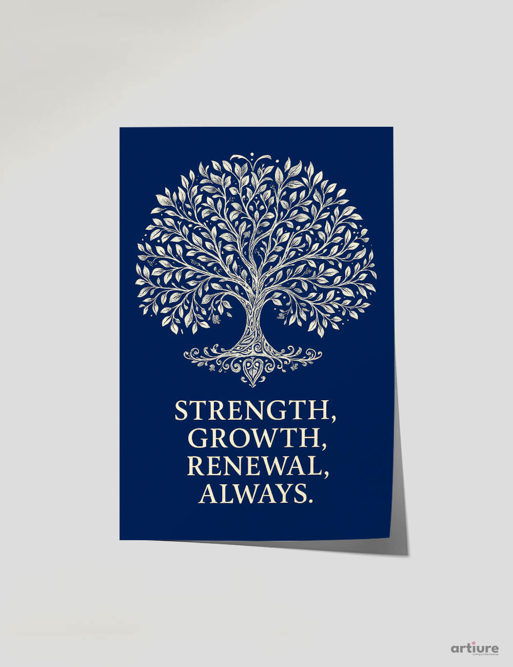 This inspirational poster captures the essence of resilience and transformation through a graceful botanical motif. The intricately designed tree, rendered in fine linework, symbolizes continuous growth and deep-rooted strength. Below it, the words "Strength, Growth, Renewal, Always." remind us to persist and evolve, no matter the season of life. Printed on FSC-certified paper, this artwork aligns with our commitment to sustainability while serving as a timeless motivator in any space.