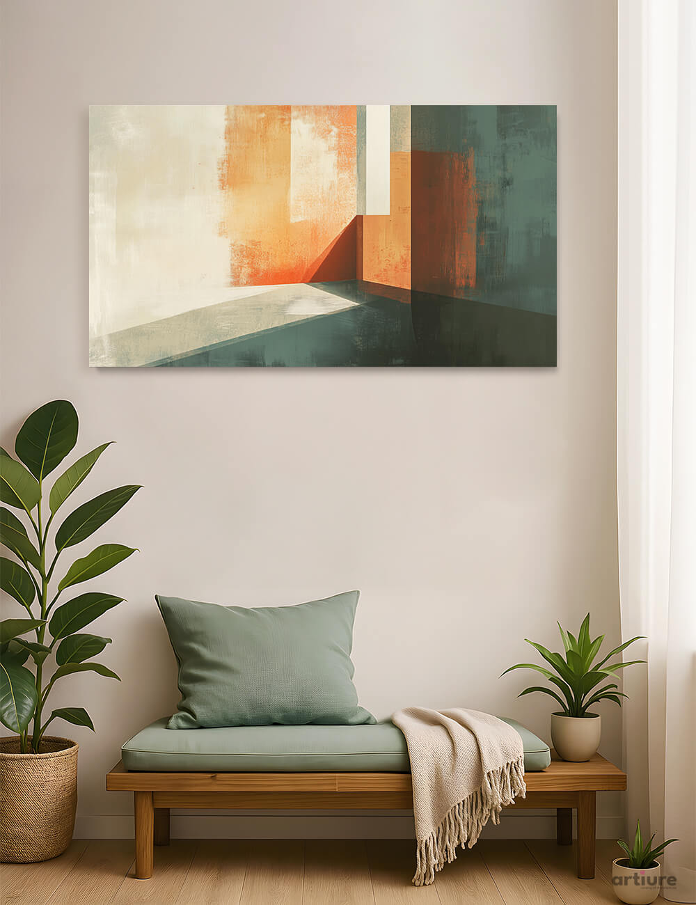 Sunlit Geometry portrays blocks of color and shifting shadows against a subdued background, creating a sense of depth and architectural intrigue. The palette of soft neutrals and warm oranges evokes modern minimalism and a quiet, reflective mood—ideal for contemporary interiors.