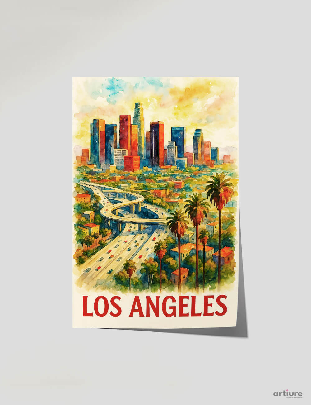 Dive into the golden charm of the City of Angels with this evocative watercolor poster. Featuring a dynamic skyline under a sunset sky, flanked by soaring palm trees and the iconic LA freeways below, this artwork is a tribute to the city’s electric rhythm and West Coast spirit.