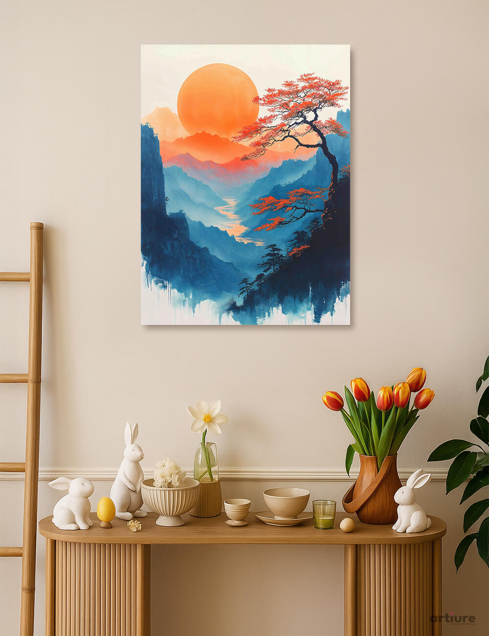 This canvas print merges a blazing orange sun with cobalt peaks and misty valleys in a contemporary landscape. A wind-swept tree with red foliage threads the composition, creating a dynamic contrast against the cool blues. The layered gradients evoke depth and distance, inviting quiet reflection as light shifts across the valley. Rendered in a painterly illustration style, the scene balances bold color blocks with soft edges for an airy, modern feel. Perfect for living rooms, home offices, or gallery-inspired hallways, it brings warmth and movement to neutral spaces while staying refined and serene. Printed on premium canvas, the piece delivers museum-quality presence with a tactile, textured finish that catches the eye from multiple angles.