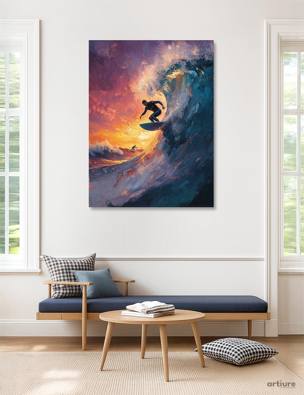 An energetic canvas print captures a surfer riding a curling wave at the moment of sunset, rendered in bold, painterly strokes. The composition erupts with warm oranges and golds that melt into pinks and purples, then cool into deep blues as the wave twists across the frame. This AI-generated piece blends impressionistic texture with contemporary energy, making a dynamic focal point for living rooms or creative spaces. Printed on premium canvas, the image preserves the brushwork and luminance of the original, ready to hang in a bright wall gallery or a cozy lounge. Its vibrant palette and sense of motion invite movement and optimism into any interior.