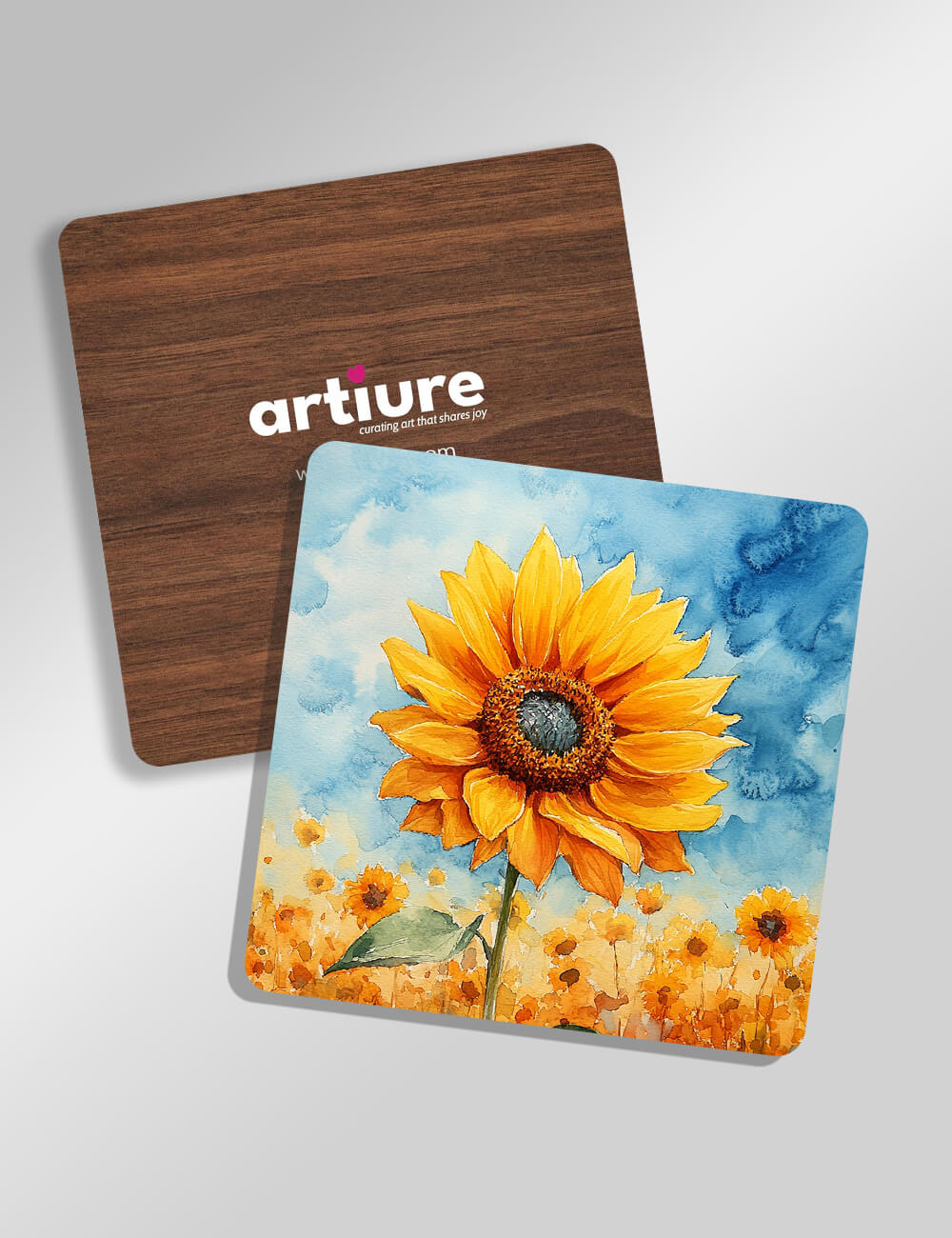 Inspired by sunlit fields, this coaster design features a bold sunflower rendered in watercolor against a airy blue sky. The warm yellows and oranges contrast with the cool backdrop, while the wood-toned backing adds an earthy, tactile feel. Perfect for brightening a kitchen or dining nook, it pairs rustic charm with a contemporary print sensibility. Use it to protect surfaces and spark joyful moments during casual meals, coffee breaks, or gather-round conversations. The piece reads as both art and accessory—a cheerful focal point that elevates everyday rituals with a touch of sunny optimism.