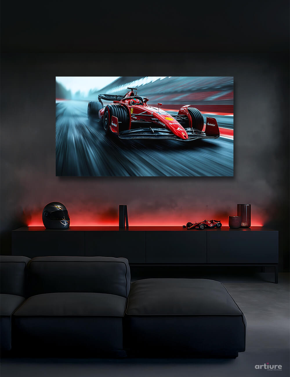 Symphony in Scarlet captures the fierce ballet of velocity — a scarlet Formula 1 car slicing through wet asphalt, its tires carving echoes into the track’s memory. Rain streaks like applause, and every droplet seems to chase the brilliance of motion. This canvas doesn’t just freeze a moment; it immortalizes adrenaline, engineering, and elegance in perfect harmony. For those who live for the chase, and the art of control in chaos.