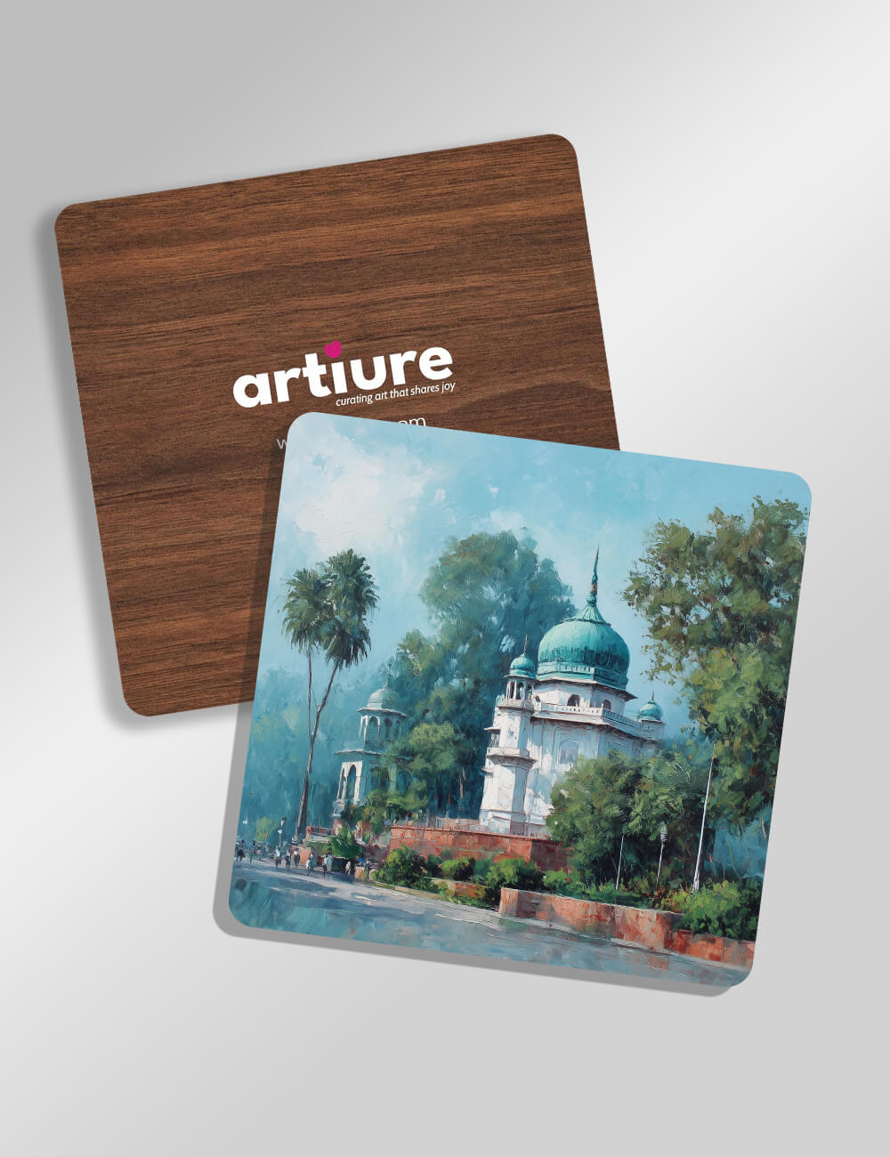 This decorative coaster features a painterly depiction of a temple with a turquoise dome, nestled among tall palms and emerald foliage. The scene blends soft, sunlit skies with bold brushwork to evoke a timeless garden atmosphere. The warm wood back provides contrast to cool blues and greens, making the artwork pop on dining tables, coffee nooks, or office spaces. Subtle shadows and highlights create depth, while rounded corners enhance the tactile feel. Ideal for everyday rituals or gifting, the piece pairs cultural charm with practical use, adding a touch of serene grandeur to kitchens and living areas. Printed on a wood-backed surface, it balances artistry with durable everyday utility.