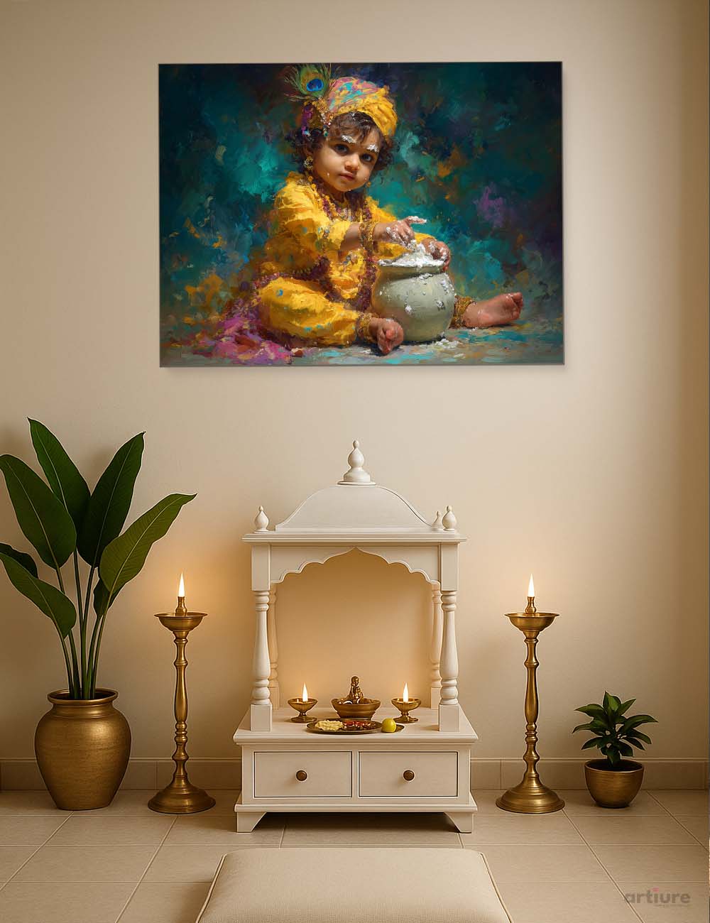 "The Butter Thief" Canvas Print captures the playful innocence of Krishna as a child, his hand deep in a pot of butter, eyes gleaming with mischief. Adorned in bright yellow with a peacock feather atop his head, the artwork blends vibrant impressionist brushwork with mythological warmth. A radiant teal and jewel-toned backdrop brings the divine presence to life, making it a beautiful centerpiece for festive décor, pooja corners, or children’s rooms.