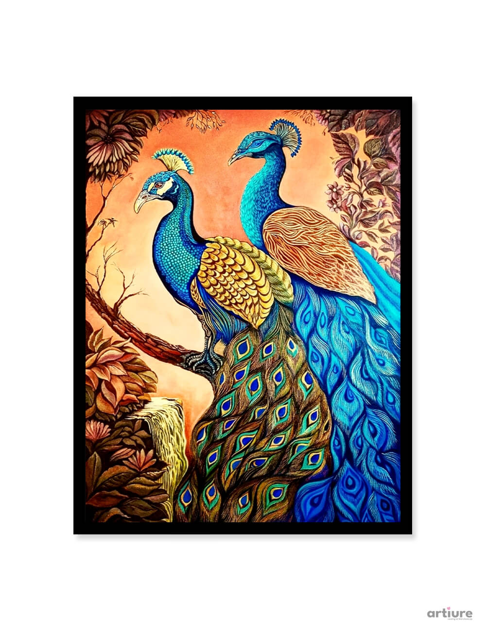 “The Reflection” captures the mesmerizing elegance of two peacocks poised in perfect harmony, symbolizing duality, balance, and inner reflection. Rendered in acrylic on canvas, the artwork showcases intricate detailing in feathers, blending rich blues, greens, and golden tones with a warm, textured background. The mirrored stance of the peacocks evokes a sense of connection, introspection, and unity within nature. Surrounded by stylized foliage, the composition feels both ornamental and deeply symbolic. This piece brings a luxurious and calming aesthetic to any space, making it ideal for collectors who appreciate fine craftsmanship, vibrant storytelling, and the timeless beauty of nature-inspired art.