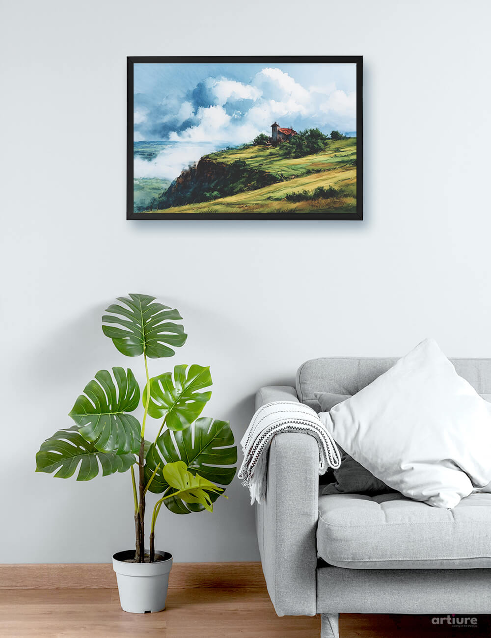 This captivating piece captures a lone watchtower nestled in a peaceful meadow atop a cliff, surveying a valley wrapped in fog. The swirling clouds and vibrant green landscape evoke both serenity and a quiet sense of awe. Perfect for interiors that celebrate nature, solitude, and dramatic skyscapes, this artwork brings space and emotion to any wall.