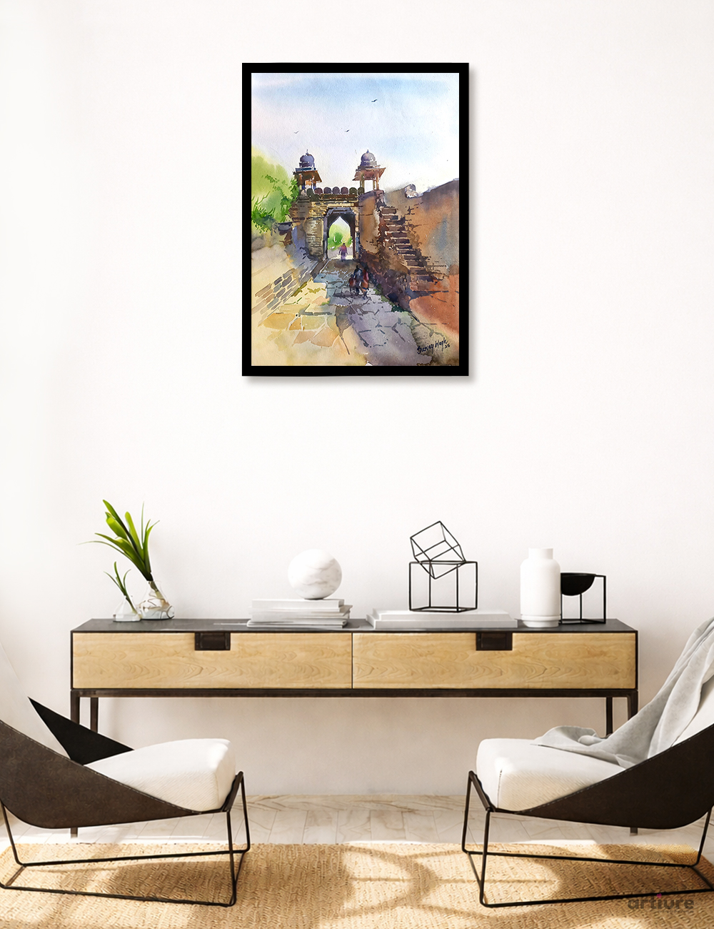 “Through the Silent Gate” beautifully captures the quiet charm of an ancient architectural passage, where time seems to slow down. The weathered stone walls, softly blended with earthy tones, guide the viewer’s eye toward the arched gateway, symbolizing transition and continuity. Gentle human figures add life while preserving the stillness of the scene, suggesting stories of daily journeys long forgotten. The watercolor technique enhances the softness of light and shadow, creating an atmosphere of calm reflection. This artwork evokes nostalgia, heritage, and tranquility, making it a perfect representation of cultural memory and the silent narratives hidden within historic pathways.