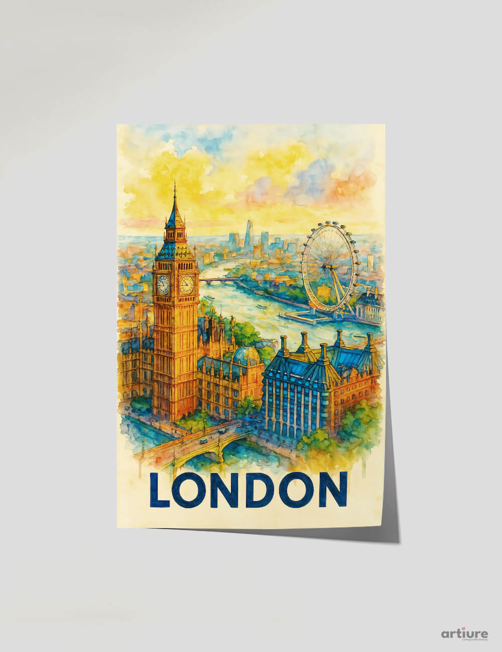 Celebrate the grandeur of London with this watercolor masterpiece that elegantly portrays the city's historic and modern marvels. Big Ben stands tall in the foreground, with the graceful arc of the London Eye and the winding Thames flowing into the horizon. The soft golden sky and painterly strokes evoke nostalgia and timelessness—perfect for lovers of British heritage and cityscapes.