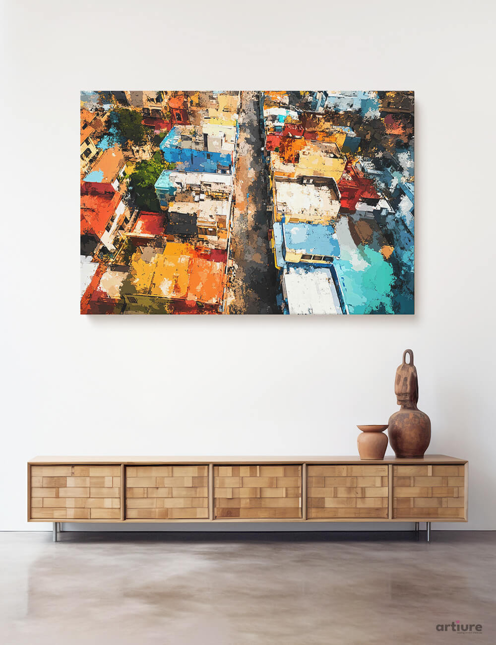 An aerial view offering a sweeping, intimate perspective of Old Delhi’s densely packed rooftops and vibrant alleyways. Rendered in expressive, collage-like brushstrokes, this artwork evokes the enduring spirit and personal memories of the historic city. Ideal for living rooms, offices, or any space where you wish to celebrate the unique charm of Old Delhi.