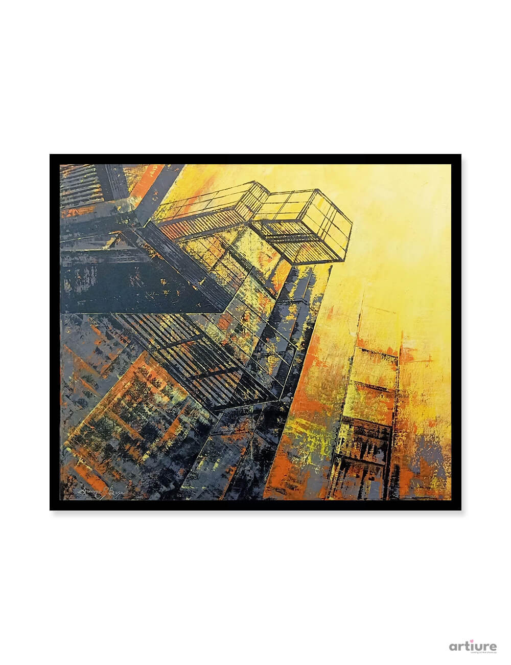 An abstract style Landscapes focusing on the interplay of light and shadow to reveal the underlying structure of the city, often overlooked in the rush of daily life. Recurring motifs like iron railings, balconies, windows and exits, elements that speak to both functionality and quiet drama of these spaces. Narrow lanes, stairs and sharp perspectives of buildings create a sense of depth. Minimalist colour palette punctured by occasional bursts of colour, emphasizes the textures and forms, transforming the familiar into something both intimate and monument al.