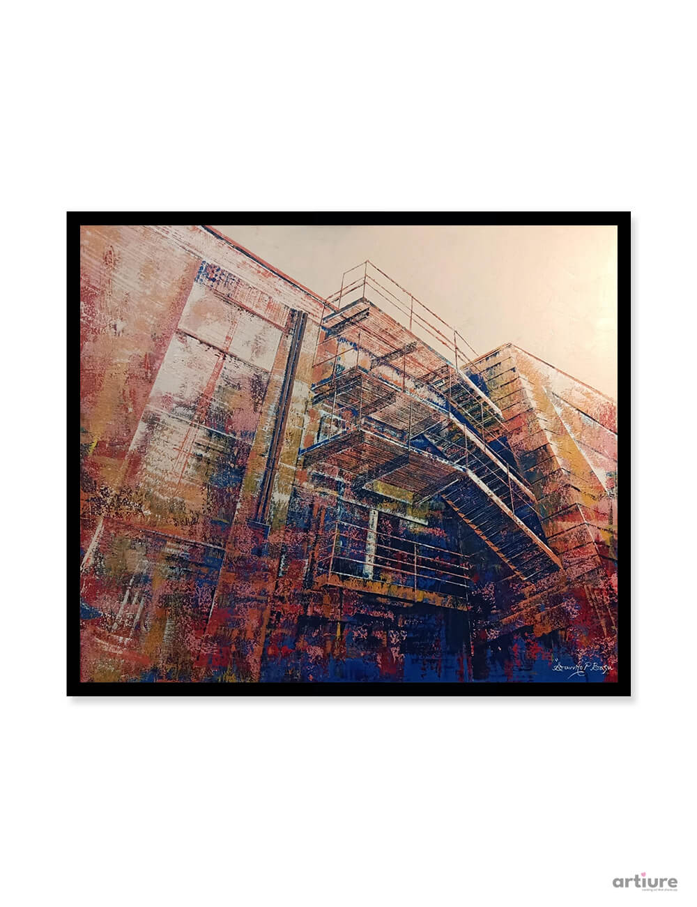 An abstract style Landscapes focusing on the interplay of light and shadow to reveal the underlying structure of the city, often overlooked in the rush of daily life. Recurring motifs like iron railings, balconies, windows and exits, elements that speak to both functionality and quiet drama of these spaces. Narrow lanes, stairs and sharp perspectives of buildings create a sense of depth. Minimalist colour palette punctured by occasional bursts of colour, emphasizes the textures and forms, transforming the familiar into something both intimate and monumental.