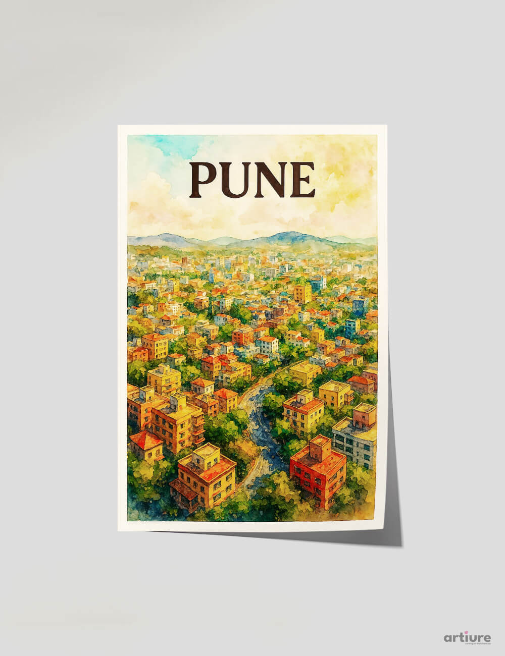 This poster brings to life the layered charm of Pune with its earthy-toned buildings, snaking roads, and sprawling green pockets. The misty hills in the background hint at the city’s closeness to nature, while the structured neighborhoods reflect its dynamic growth—ideal for contemporary interiors with an Indian city soul.