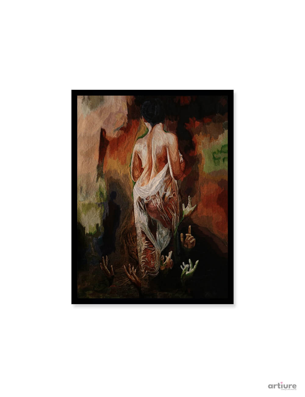 “Veil of Ascent” is a deeply evocative textile artwork by Arun Bajaj that explores the fragile intersection of vulnerability and spiritual elevation. The central figure, partially draped and ascending, symbolizes liberation from earthly constraints, while the reaching hands below suggest longing, struggle, and collective human desire. Rich, painterly textures and layered earthy tones enhance the emotional gravity of the composition, creating a sense of movement and transformation. The contrast between light and shadow amplifies the narrative of emergence and self-realization. This artwork invites contemplation, making it a striking statement piece for collectors who appreciate symbolic, emotionally charged figurative art.