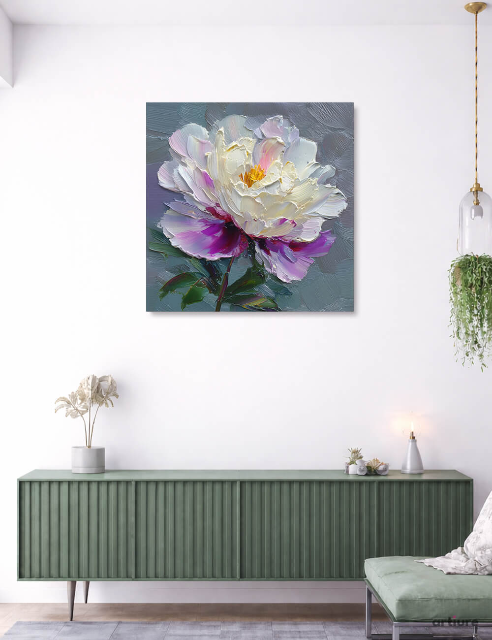 There's something about the way this peony holds itself — proud but vulnerable, like beauty that knows its own power. The petals unfurl in layers of cream and blush, with edges kissed by the softest purple, as if dawn is breaking through silk. Each brushstroke carries weight and lightness at once, the impasto technique making you want to reach out and touch the velvet softness. The golden heart glows like a secret, while deep teal shadows anchor the bloom against a moody, textured backdrop. This is the kind of piece that transforms a room's energy — hang it where you need a reminder that beautiful things take time to bloom. Perfect for a bedroom wall, a reading nook, or anywhere that deserves a daily dose of grace.