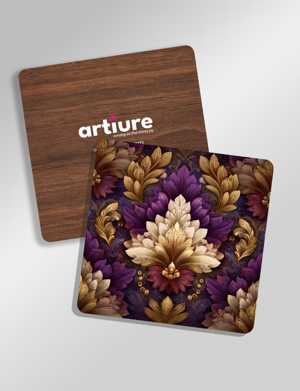 A set of decorative coasters featuring an ornate floral motif in lush purples and gold on a deep, textured backdrop. The front surface showcases detailed blossoms with ivory and copper-toned highlights, while the back offers a wood-like warmth for a natural contrast. Perfect for adding a luxurious touch to dining tables or coffee nooks, these coasters blend opulent patterning with practical protection, offering a refined statement for entertaining spaces and gifting occasions.