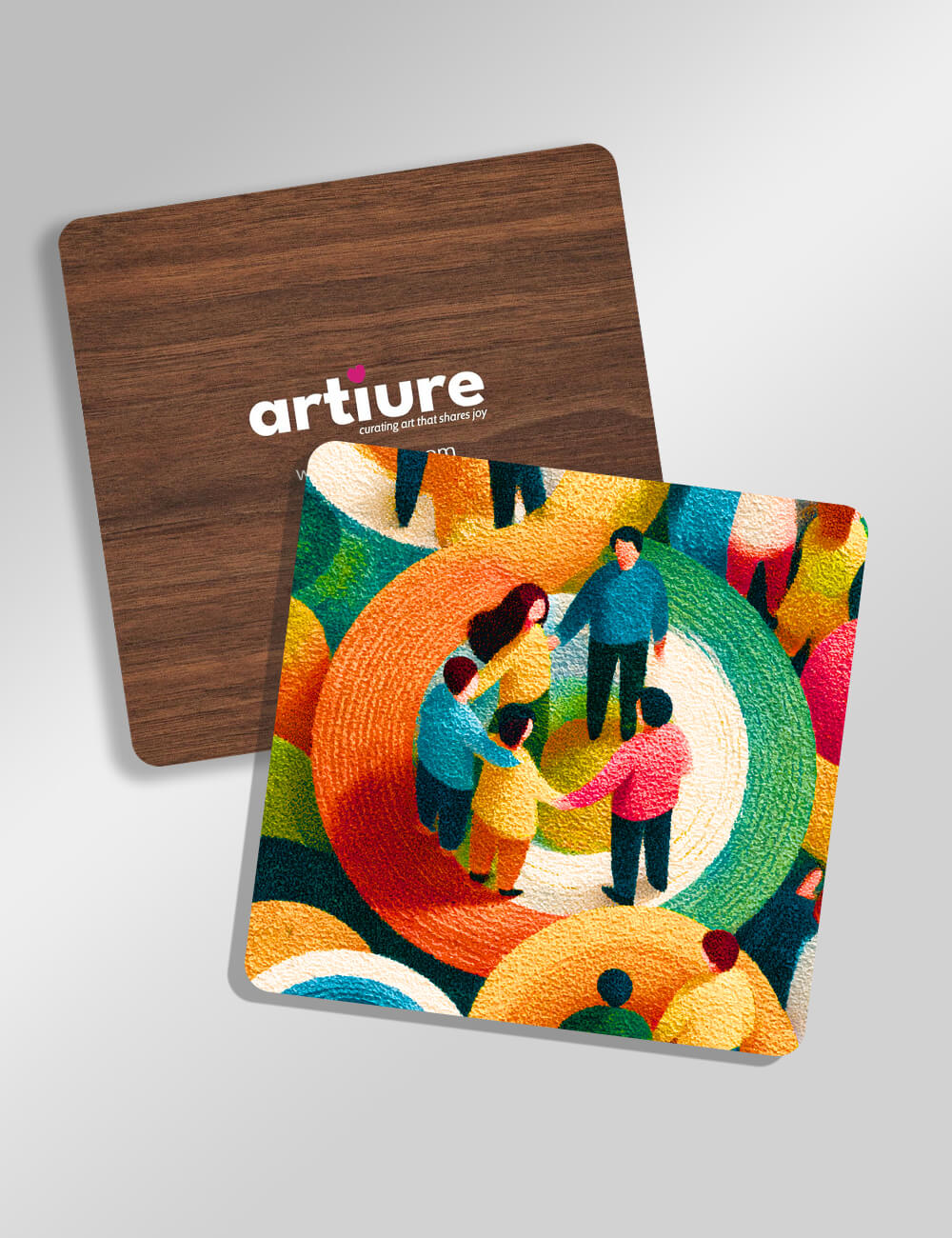 This coaster design presents a jubilant, abstract scene where circular ribbons of color weave a sense of community and warmth. Layers of concentric arcs in cobalt blue, emerald green, vivid orange, sunny yellow, and fuchsia swirl together against a ground of tactile texture, suggesting movement and unity around a central gathering. The wood back adds natural warmth and durability, making it a practical accent for dining tables, coffee nooks, or bar carts. Printed with high‑fidelity inks, the artwork remains crisp and lively beyond casual use, resisting fading with thoughtful wear. Ideal for brightening kitchen counters, entertaining spaces, or gifting to friends and hosts who appreciate bold, modern art transformed into everyday objects. A playful statement piece that pairs with contemporary and eclectic interiors alike.