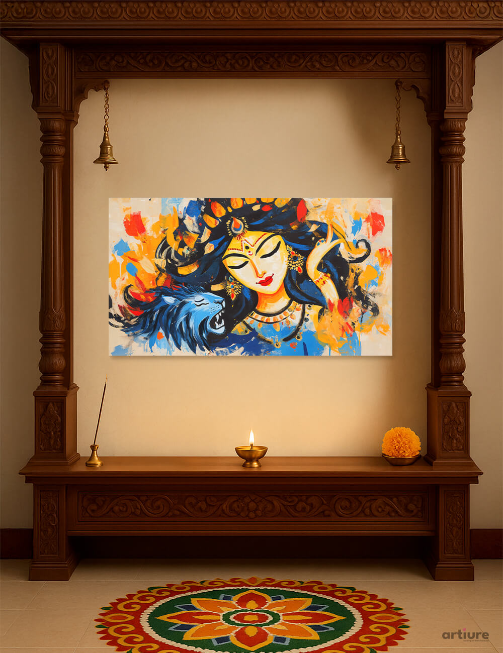 An exuberant canvas print of a stylized goddess, her face serene amidst a storm of cobalt, tangerine, and sunlit gold. The composition fuses abstract brushwork with discernible cultural iconography, set within a warm temple-like alcove. Energetic strokes and layered color create a sense of movement and devotion, while the playful palette invites both contemplation and joy. This piece bridges contemporary expression with traditional symbolism, making it an adaptable centerpiece for living rooms, bedrooms, or hallway galleries. Its luminous contrasts and tactile textures evoke warmth, ritual, and celebration—perfect for spaces that honor craft, color, and cultural storytelling.